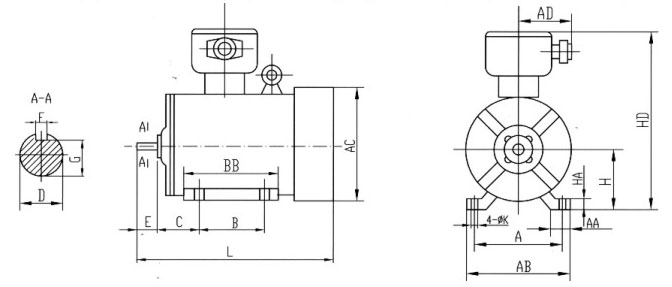 YBX3防爆電機是對YBX3系列高效率隔爆型三相異步電動機的簡稱,是在YB3防爆電機的基礎上進行改進的防爆電機,相比YB3更加高效節能,能夠取代YB3防爆電機的適用性。效率符合GB18613-2012《中小型三相異步電動機能效限定值及能效等級》中的2級能效,且具有性能優良,使用安全可靠,振動、噪聲比同類產品降的特點,符合環保要求。本系列電動機防爆性能符合GB3836.1-2010《爆炸性環境第1部分:設備通用要求》和GB3836.2-2010《爆炸性環境第2部分:由隔爆外殼“d”保護的設備》的規定,制成隔爆型。防爆標志為Ex dⅡA T4 Gb、Ex dⅡB T4 Gb,Ex dⅡC T4 Gb,適用于有爆炸性氣體混合物存在的場所。 Ex dⅡA T4 Gb適用于工廠用IIA類,溫度組別為T1、T2、T3和T4組爆炸性氣體混合物存在的環境。 Ex dⅡB T4 Gb適用于工廠用IIB類,溫度組別為T1、T2、T3和T4組爆炸性氣體混合物存在的環境。 Ex d ⅡC T4 Gb 適用于工廠用IIC 類,溫度組別為T1、T2、T3 和T4 組爆炸性氣體混合物存在的環境。 在YBX3 基本系列電動機基礎上,也可制成YBX3-W 戶外型、YBX3-TH 濕熱帶型、YBX3-THW戶外濕熱帶型、YBX3-TA 干熱帶型、YBX3-TAW 戶外干熱帶型、YBX3-T 熱帶型、YBX3-TW 戶外熱帶型及YBX3-WF1 戶外中等防腐蝕型等氣候環境條件。